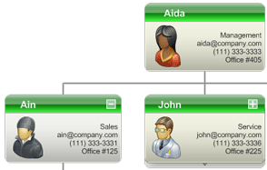 Organizational charts can be created using .netCHARTING by getting data from live databases or by adding it manually in code. Organizational nodes can be decorated and styled in many ways by using the element annotation properties. Using the label markup language; custom layout, images and other content can be organized inside each node. Rich interactivity features are provided to enable organizational chart drilldown, node expansion, and AJAX scrolling for large datasets. Other useful navigation features include drilldown breadcrumbs and indicators to accent the node appearance.